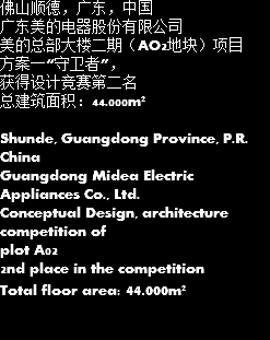 佛山顺德,广东,中国 广东美的电器股份有限公司 美的总部大楼二期(AO2地块)项目 方案一“守卫者”, 获得设计竞赛第二名 总建筑面积:44.000m² Shunde, Guangdong Province, P.R. China Guangdong Midea Electric Appliances Co., Ltd. Conceptual Design, architecture competition of plot A02 2nd place in the competition Total floor area: 44.000m²